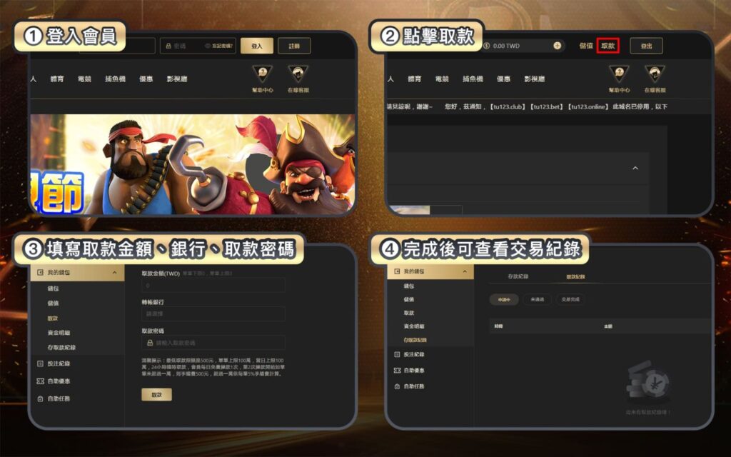 如何出金HOW TO WITHDRAW 娛樂城出金 各大銀行轉帳/ATM轉帳儲值 中國信託 台中銀行 合作金庫 台新銀行 國泰銀行 中華郵政 最低提款 $1000 - 無上限 立刻出金 電腦版出金教學 1 登入 GAME會員 註冊 2 右上角 點選取款 3 填入真實姓名 綁定銀行資料 4 輸入金額 確認綁定資料 5 送出完成 取款成功 開始遊戲 GAME娛樂城存取款教學 如何出金 手機版出金教學 1 登入 GAME會員 註冊 2 下排 點選取款 3 填入真實姓名 綁定銀行資料 4 輸入金額 確認綁定資料 5 送出完成 取款成功 開始遊戲 GAME娛樂城存取款教學 如何出金 註冊